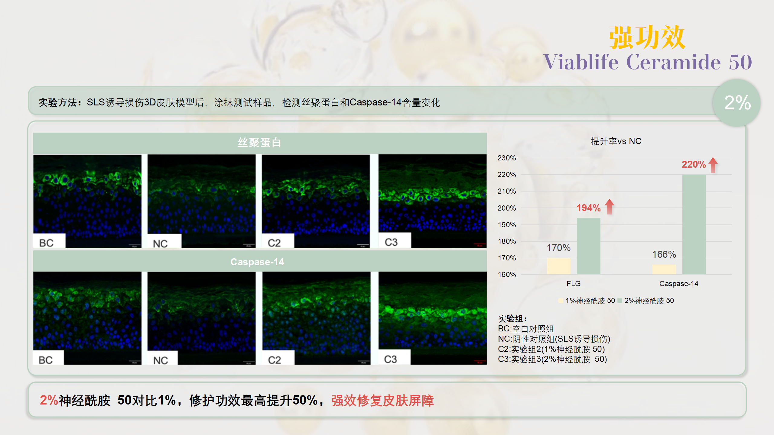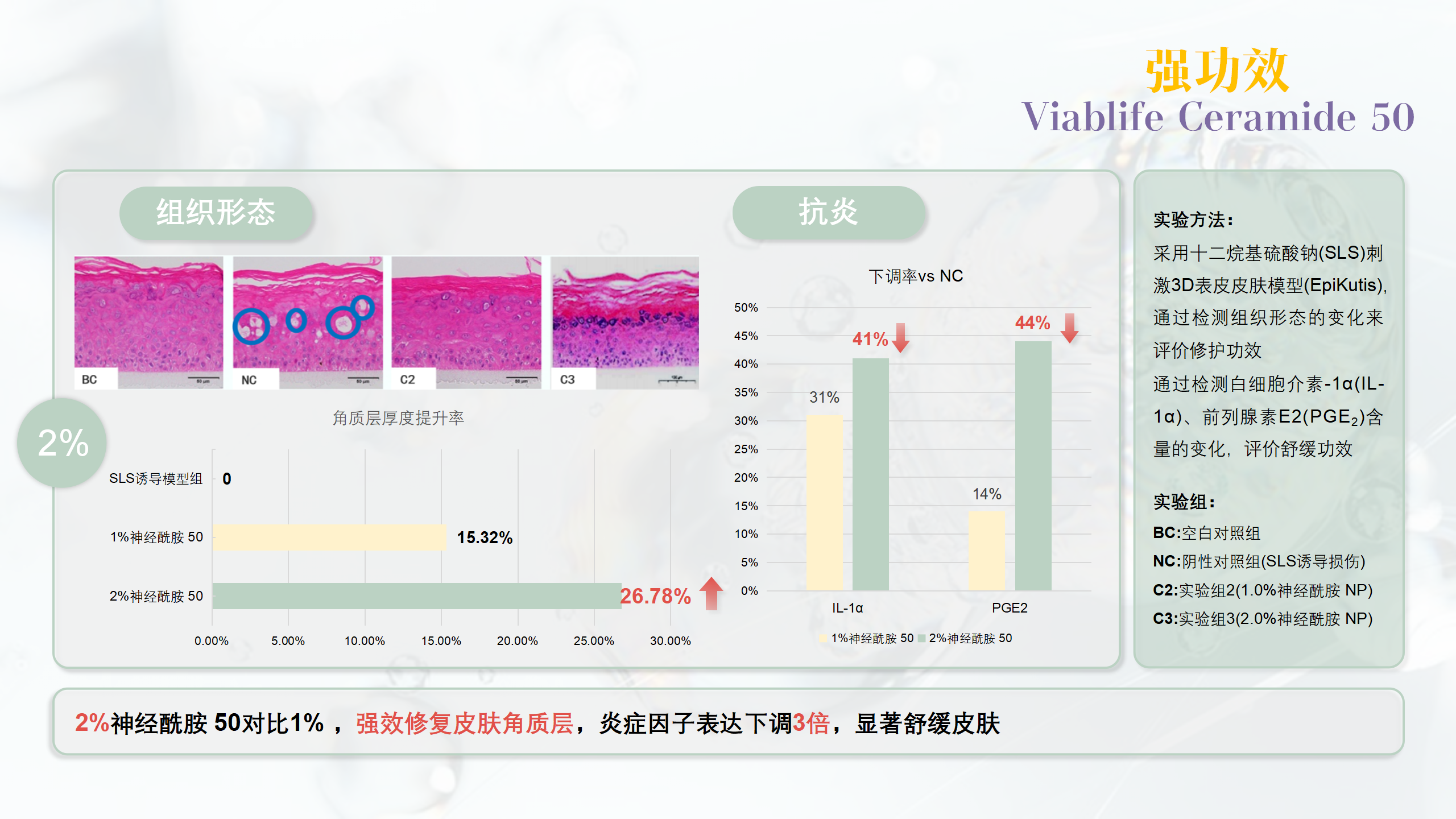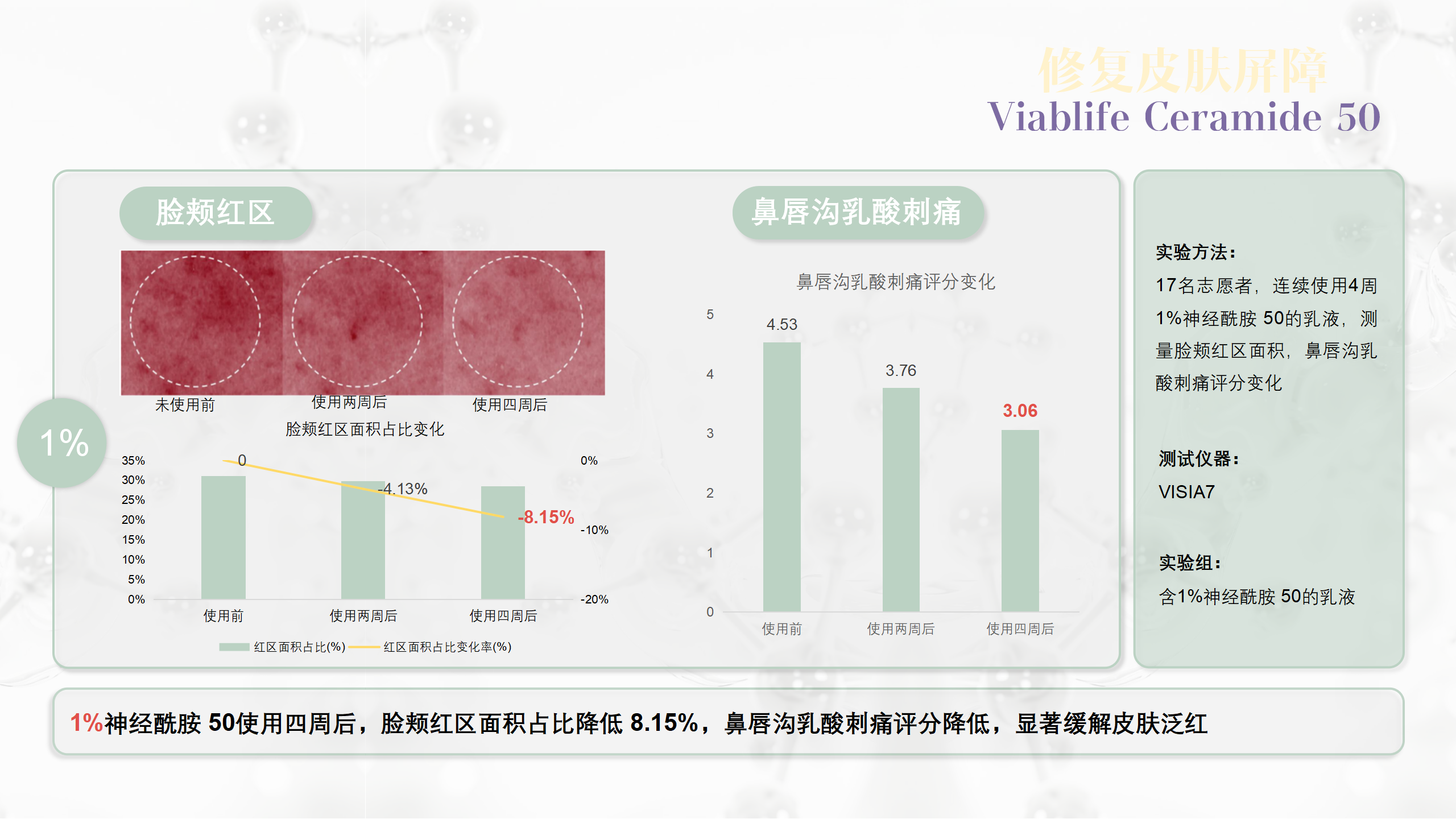 唯铂莱神经酰胺50采取固体微胶囊技术,通过将活性成分——神经酰胺NP包裹在一个微小的胶囊中来保护和控制它的释放,从而解决神经酰胺面临的传统困境。类似于油包水的乳液,将其中的液体脂质置换为固体脂质,在室温先以固态呈现,因此具有极高的包封率。产品在常温下即可水分散,精简的四组分,解除“无效添加”、“风险引入”烦恼,50%的神经酰胺的含量,发挥极佳的功效。