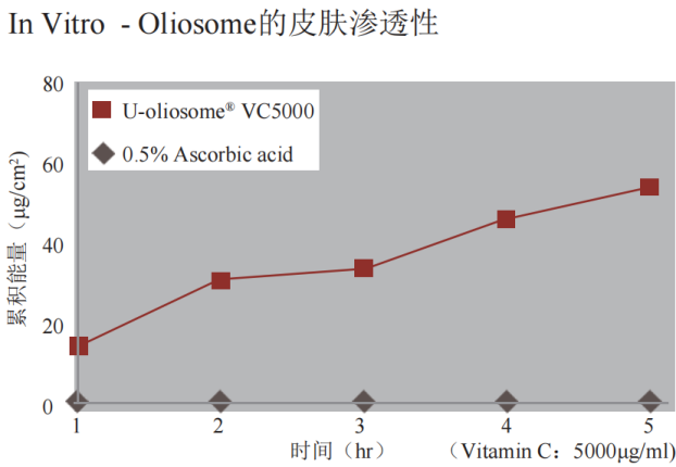 验表明U-Oliosome®VC5000的肌肤累积渗透率是空白组的54倍