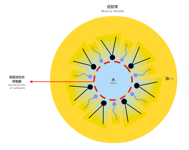 SynBiOil EX形成的反胶束预计由类型为①(倒三角)的表面活性剂和各种脂质代谢物(辅助表面活性剂)组成