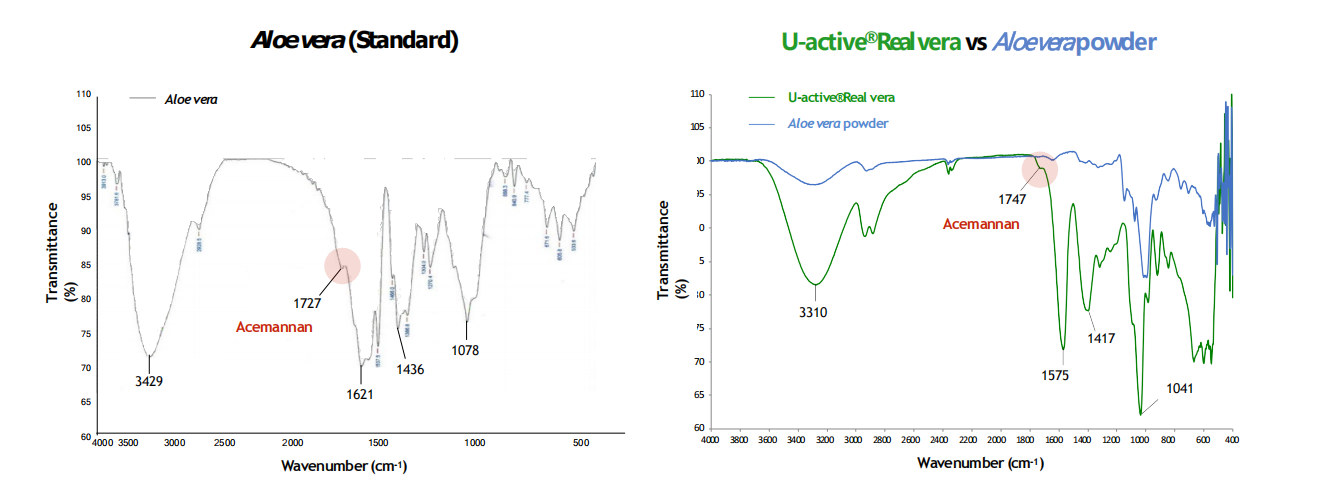 相较于市售的芦荟粉产品,U-active Real vera的FT-IR图谱更接近于自然中Aloe vera粘多糖的图谱,含有更多的糖类、糖醛酸以及乙酰化甘露聚糖等成分。