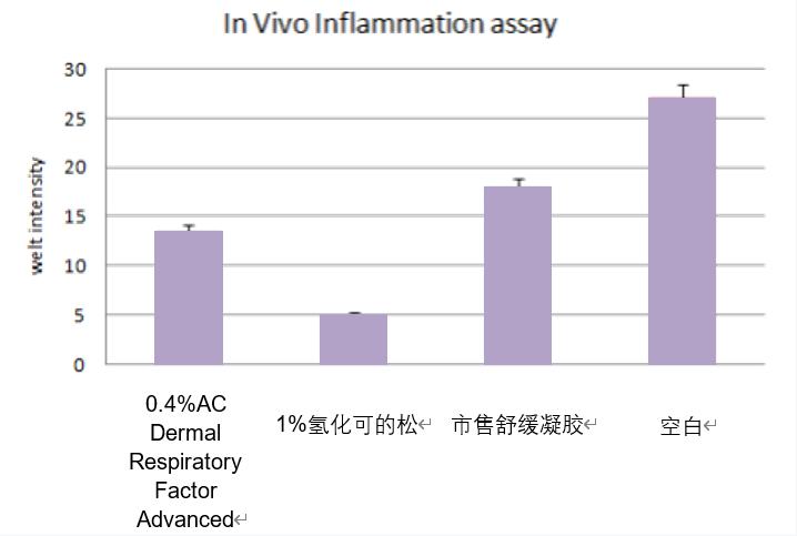 志愿者前手内壁用葛根提取物刺激,10min后在4个测试区域分别涂抹不同产品舒缓,24小时后评估红肿程度,持续三天,0.4% AC DRF可缓解46%的红肿