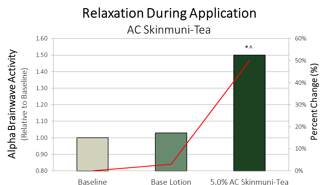 5.0% AC Skinmuni-Tea 可在30秒钟的使用时间内使α-脑电波活动明显增加 50%,使人更加放松和平静,从而提升消费者体验