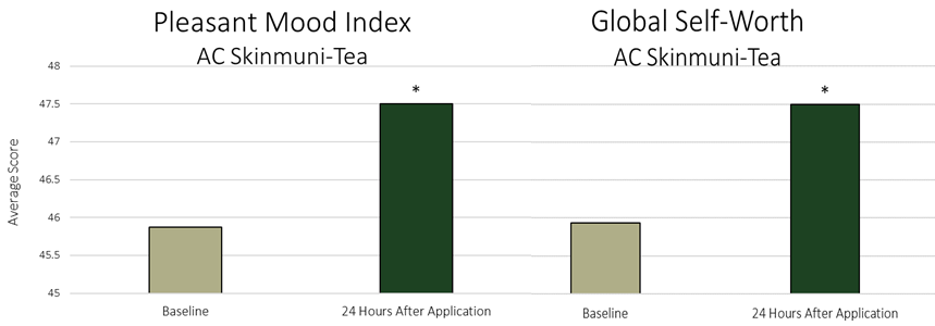 使用含5.0% AC Skinmuni-Tea的乳液24小时后,可使愉悦情绪提高4%,自我价值提高2%,激发可感知的情绪效果。
