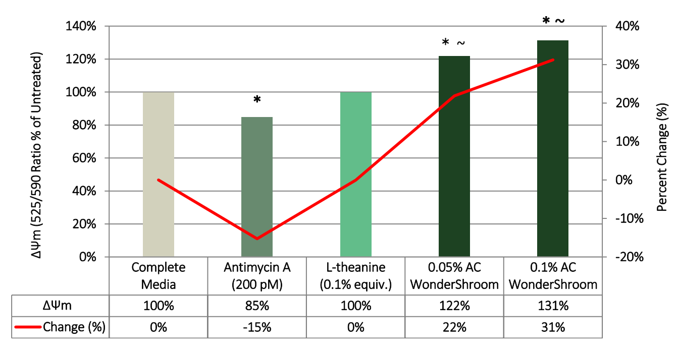 0.1% 浓度的AC WonderShroom使线粒体膜电位(ΔΨm)增加31%,从而促进氧化磷酸化进程,增强线粒体活力和细胞能量产生,恢复皮肤的年轻光泽。