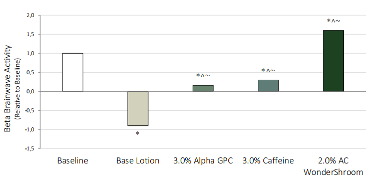 2.0%的AC WonderShroom可在30秒的使用过程中使β-脑电波活动显著增加160%,有助于促进积极情绪和大脑意识,从而更好地应对压力和挑战。